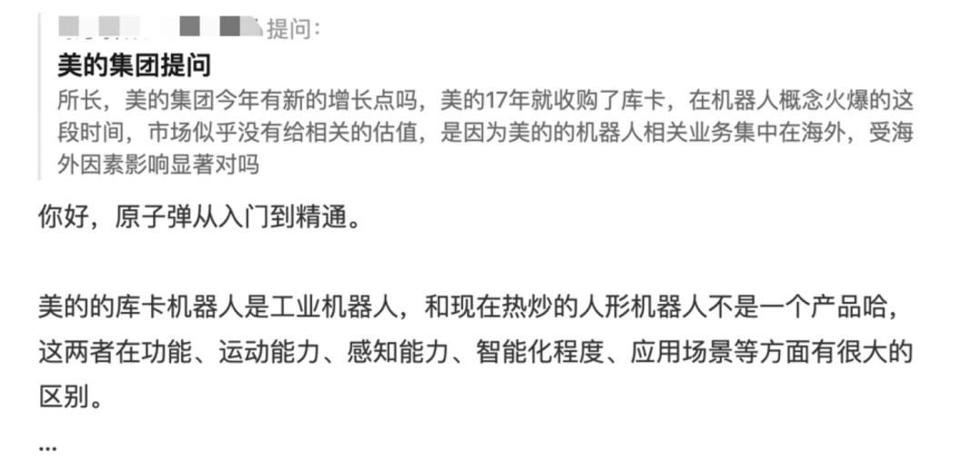 此前,《所长会客厅》就有同学对美的的机器人进行提问,专门提到了库卡,当时所长回答的第一句就是“美的的库卡机器人是工业机器人,和现在热炒的人形机器人不是一个产品”,当然所长还详细解释了这两者的区别,简单粗暴的理解就是,工业机器人是牲口,人形机器人是人。