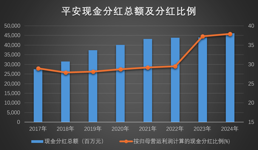 经营业绩增长的同时,平安集团注重股东回报。年报显示,平安集团拟派发2024年末期股息每股现金1.62元,全年股息为每股现金人民币2.55元,同比增长5%。基于归母营运利润计算的现金分红比例为37.9%,分红总额连续13年增长。