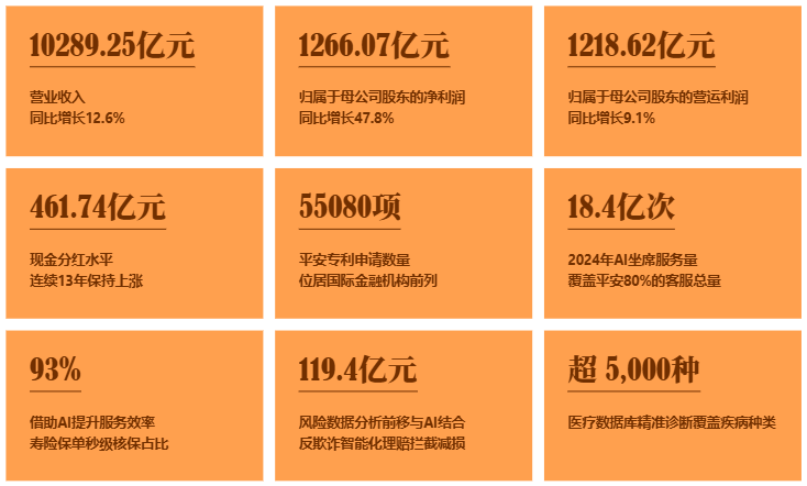 2024年,平安集团实现营业收入10289.25亿元,同比增长12.6%;实现归属于母公司股东的营运利润1218.62亿元,同比增长9.1%;归属于母公司股东的净利润1266.07亿元,同比增长47.8%。