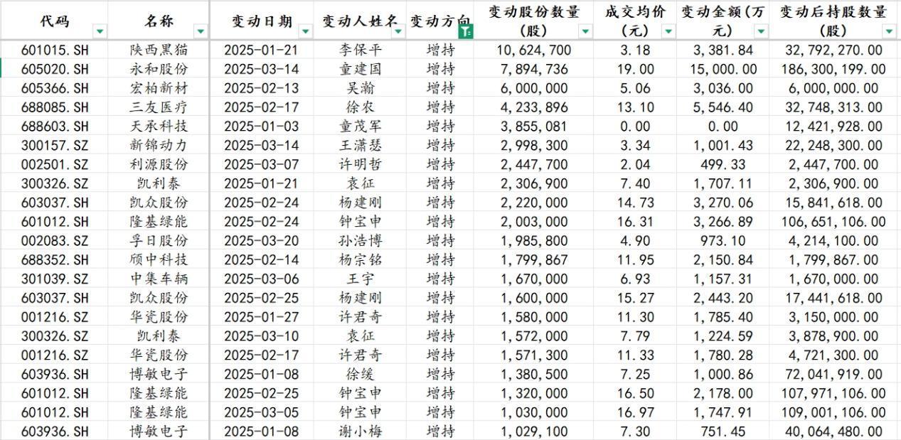 其中,永和股份董事长童建国增持798.47万股,增持金额15000万元,变动后持股数为1.86亿股;宏柏新材董事吴瀚增持600万股,增持金额3036万元,变动后持股数为600万股;三友医疗董事总经理徐农增持423.39万股,增持金额5546.4万元,变动后持股数为3274.83万股;天承科技董事长童茂军增持385.50万股,变动后持股数为1242.19万股;新锦动力董事王潇瑟增持299.83万股,增持金额1001.43万元,变动后持股数为2224.83万股;利源股份董事长许明哲增持244.77万股,增持金额499.33万元,变动后持股数为244.77万股;孚日股份副总经理孙浩博增持198.58万股,增持金额973.10万元,变动后持股数为421.41万股;颀中科技董事长杨宗铭增持179.98万股,增持金额2150.84万元,变动后持股数为179.98万股;中集车辆董事王宇增持167万股,增持金额1157.31万元,变动后持股数为167万股;博敏电子董事长徐缓增持138.05万股,增持金额1000.86万元,变动后持股数为7204.19万股;博敏电子董事谢小梅增持102.91万股,增持金额751.45万元,变动后持股数为4006.44万股。