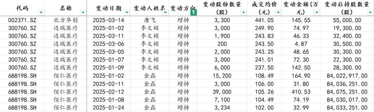 迈瑞医疗成交均价最高为249.90元/股,其董秘李文楣累计增持1.61万股,增持金额389.62万元,变动后持股数为3.24万股。