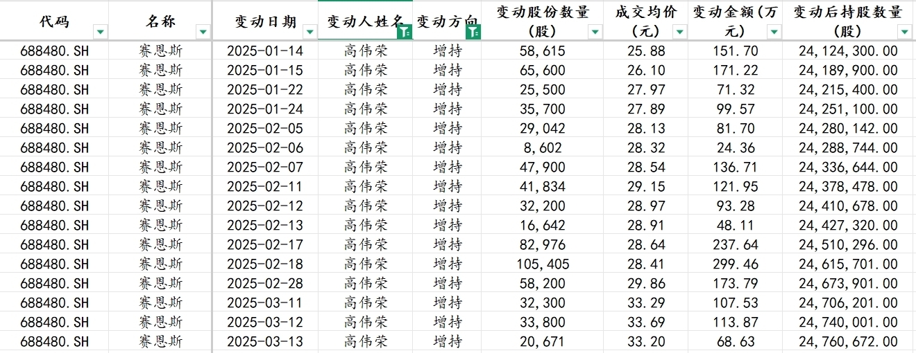 从增持数量来看,赛恩斯董事长高伟荣最高,今年以来已增持公司股份达16次,最终变动后持股数为2476.07万股,累计增持金额为2000.82万元。