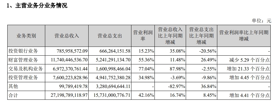 从主营业务来看,公司投资银行业务、财富管理业务、交易及机构业务营业收入均较上年同期有所上升,投资管理业务、其他业务收入出现下滑。