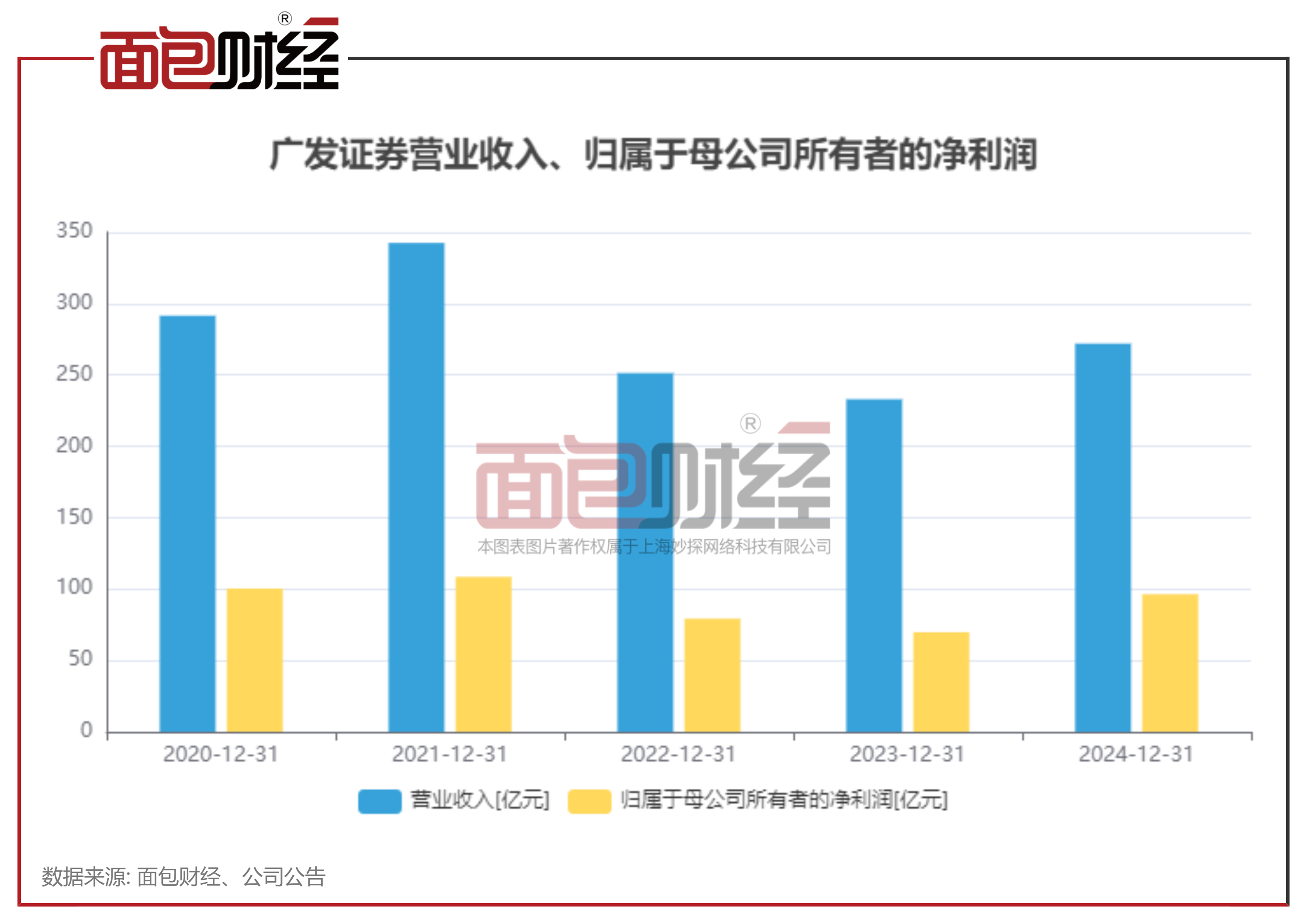 年报显示,2024年度,广发证券实现营业收入271.99亿元,同比上升16.74%,归母净利润96.37亿元,同比上升38.11%。此前,广发证券营收及归母净利润已连续两年下降,今年迎来业绩反弹。