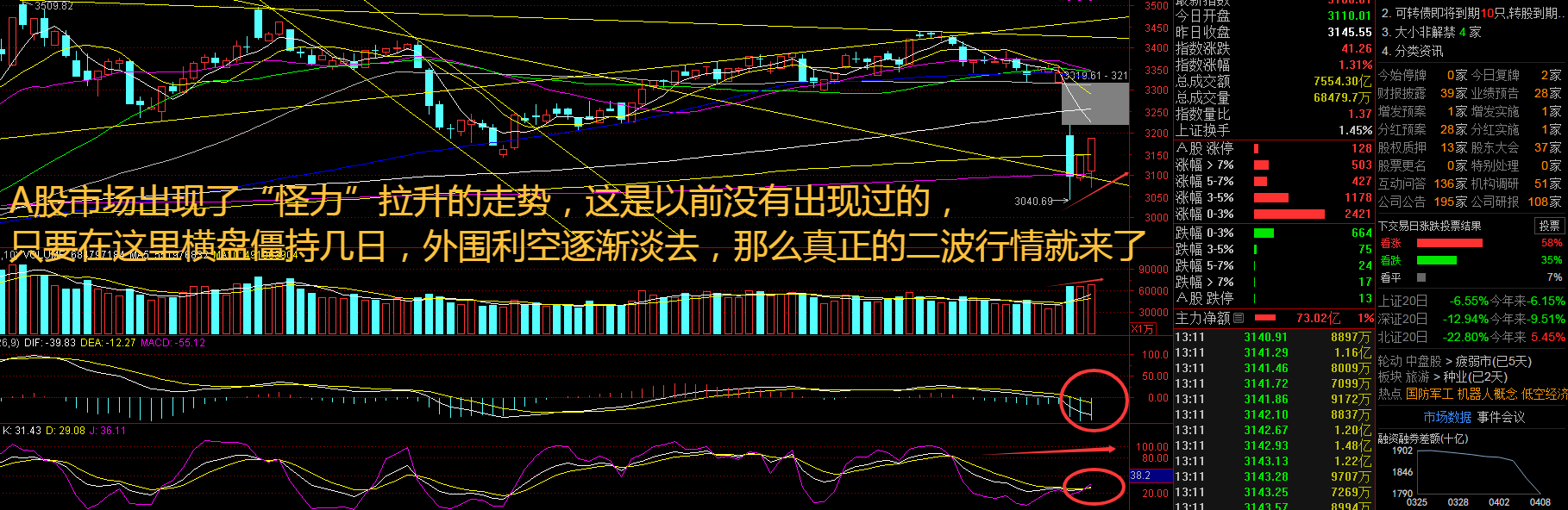 上证指数周三出现了低开高走的态势,但是并没有出现再度大涨的局面,说明资金还是护盘为主,并没有主动性拉升,投资者要明白现在的盘面语言:“防守而不是上攻!”在全球资本市场震荡加剧的当下,公私募机构坚定看好中国资产。4月8日晚,博时基金、鹏扬基金等公募基金公司公告称,基于对中国资本市场长期健康稳定发展的信心,将于近日运用固有资金投资各自旗下权益类基金。多家知名私募机构也以行动表达对于后市的看好。接下来注意上证指数能否在3100点之上稳住。