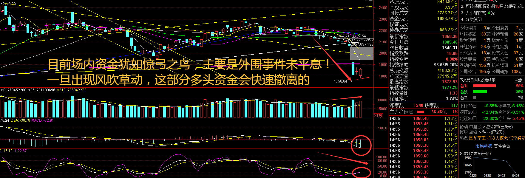 创业板指数周三出现中小盘股拉升的迹象,军工和半导体芯片板块表现较强,目前还是围绕关税问题展开炒作,要注意的是消费股与农业股退潮,现阶段追涨仍然是为别人做嫁衣。4月8日上午,进化论资产CEO、首席投资官王一平在社交平台发文称自己组合已满仓。在公私募机构人士看来,尽管全球基本面风险增加,但国内逆周期政策已有储备,后续投资更重要的逻辑在于“以内为主”,科技、医药、消费等板块值得重点关注。接下来注意创业板指数能否在1800点之上稳住。