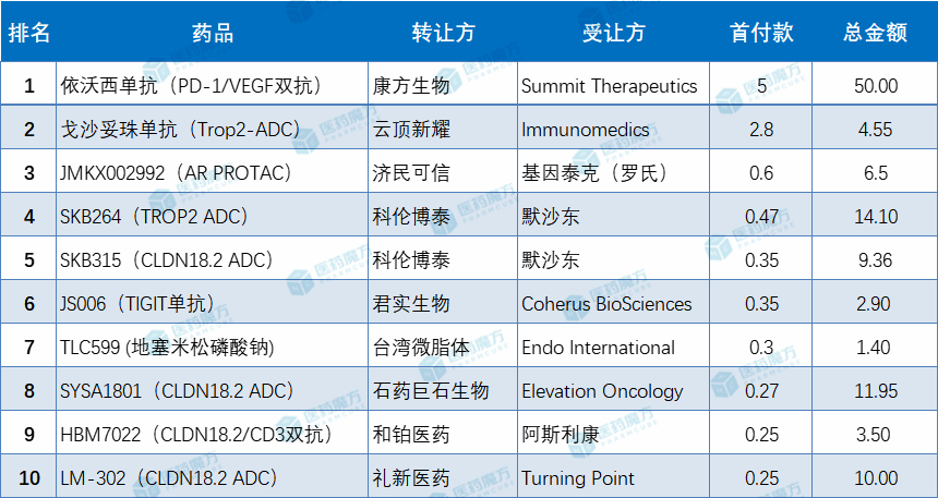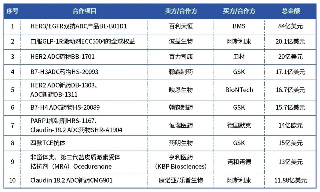 话说到这里,我们也呼应一下本文开头药明生物老陈所讲的话。下图分别是2024、2023、2022三年国内创新药license out公开披露总金额排名靠前的交易,除了2022,后面能上榜的总交易金额都在10亿美元以上,仔细看这些十亿大交易,里面大概率就藏着未来国内最牛的药企。