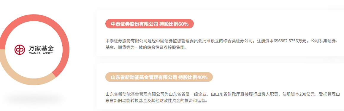 万家基金成立于2002年,中泰证券股份有限公司 、山东省新动能基金管理有限公司分别持股60%、40%。