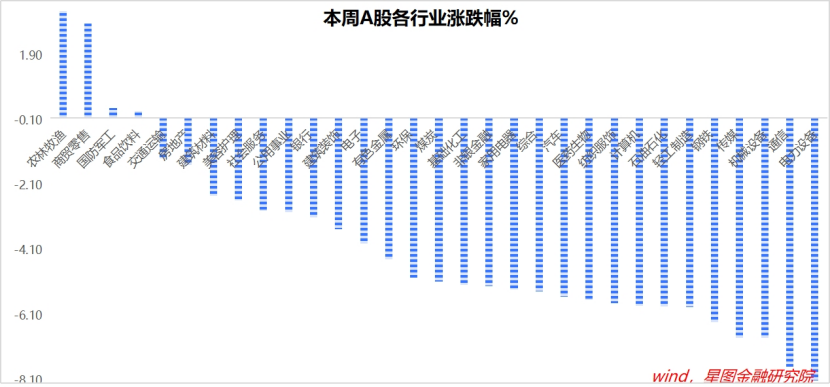 行业层面,农林牧渔(3.28%)、商贸零售(2.88%)、国防军工、食品饮料逆势收涨;电力设备(-8.09%)、通信(-7.07%)、机械设备、传媒、钢铁均跌超6%。