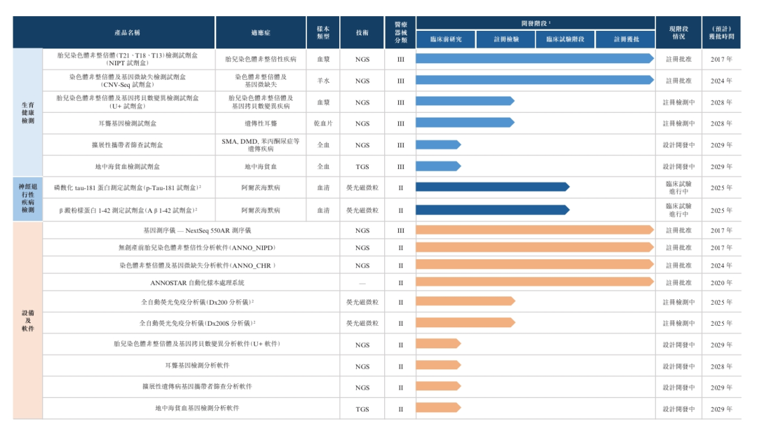 根据招股书,安诺优达产品管线包括生育健康检测、神经退行性疾病监测、设备及软件。截至最后实际可行日期,公司的三款IVD产品已获得三类医疗器械证书,两款兼容的生物信息学分析软件产品已获得二类医疗器械证书,以及12款IVD产品正在开发中。