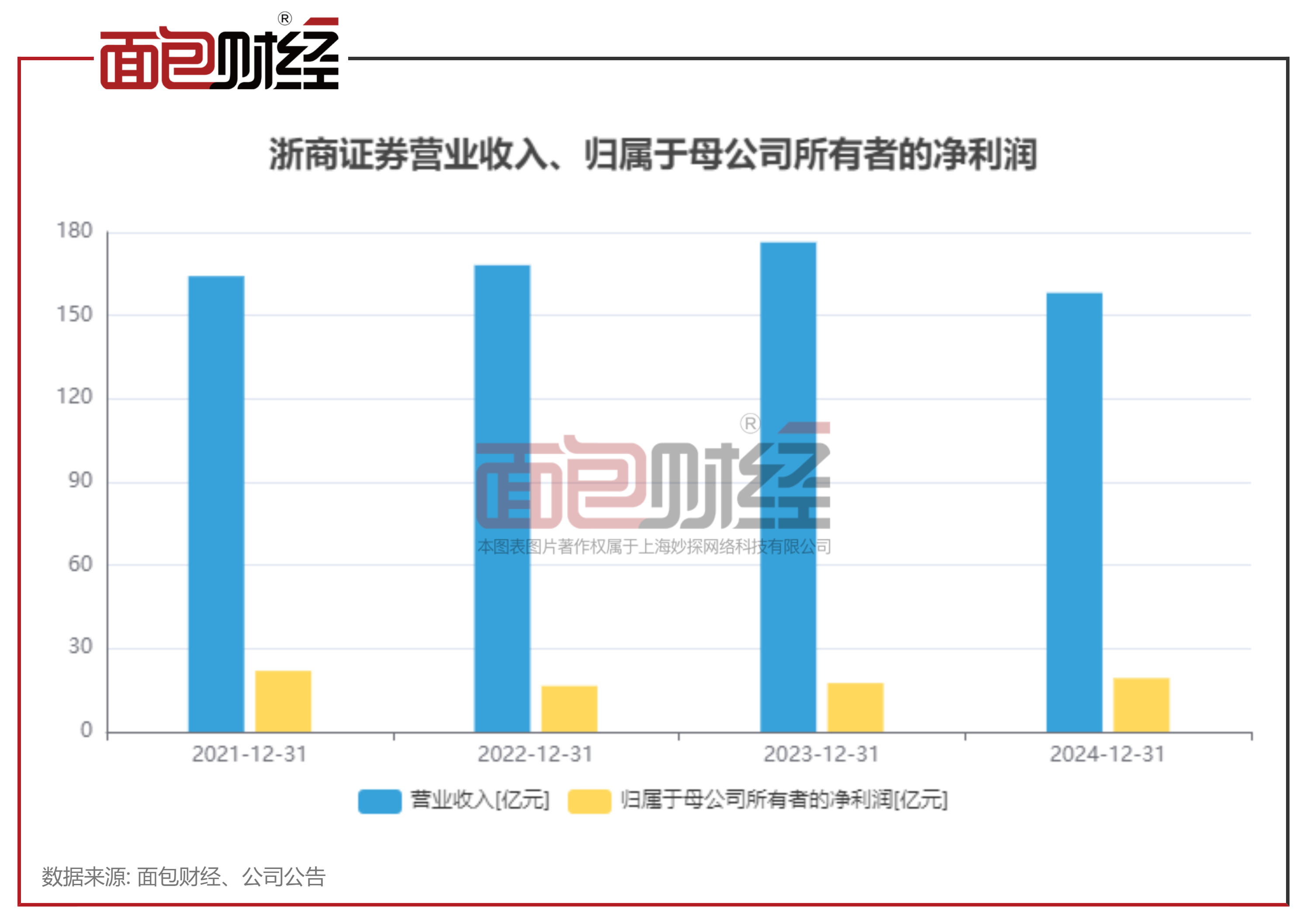 年报显示,2024年度,浙商证券实现营业收入158.16亿元,同比下降10.33%,归母净利润19.32亿元,同比上升10.17%。