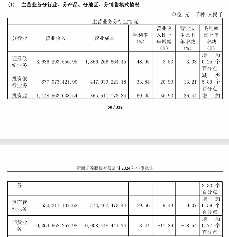 分析发现,浙商证券的六成以上收入来自期货业务,该业务2024年收入同比下滑17.89%,投资银行业务收入同比下滑20.93%。