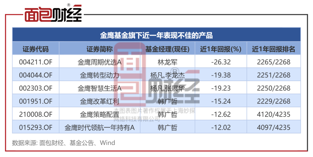 除了金鹰周期优选A,金鹰基金旗下金鹰转型动力、金鹰智慧生活A、金鹰改革红利等多只基金近一年净值跌幅超过10%,在同类基金中排名靠后。