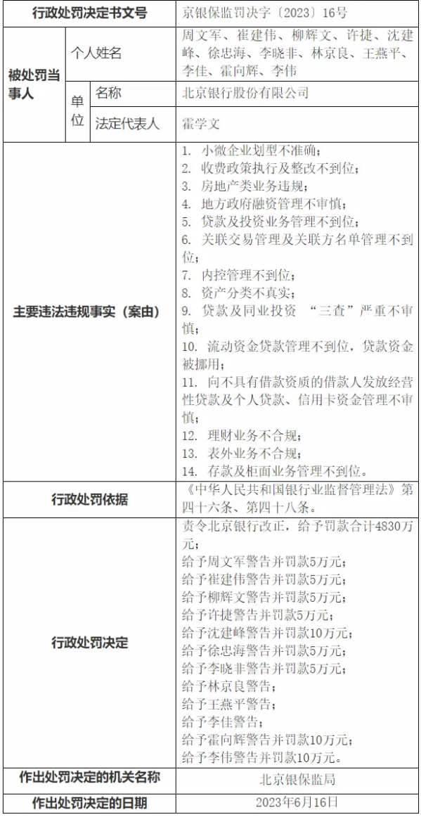2023年6月,北京银行就曾因小微企业划型不准确;收费政策执行及整改不到位;房地产类业务违规;地方政府融资管理不审慎等违规行为被处以4830万元的巨额罚款。