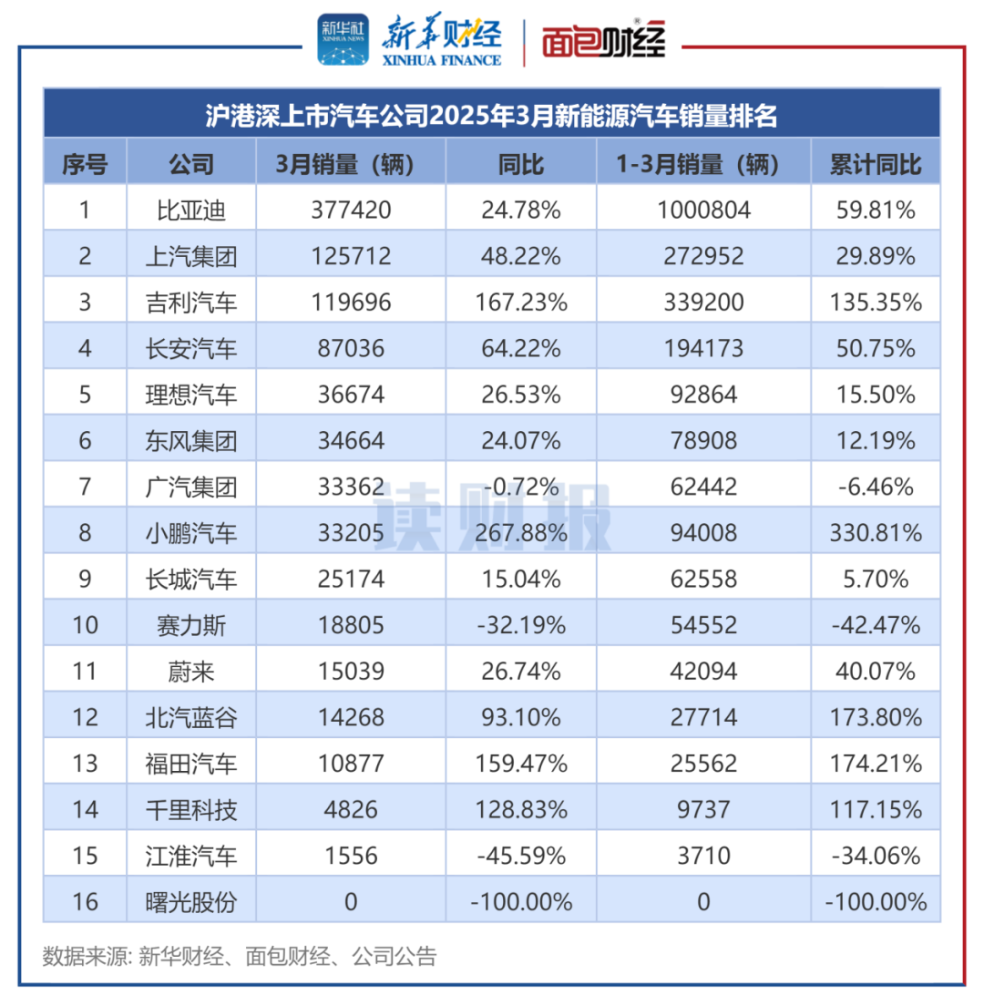 数据显示,比亚迪以37.74万辆位居行业第一,上汽集团、吉利汽车的3月新能源汽车销量均超过10万辆。增速方面,小鹏汽车、吉利汽车、福田汽车的同比增速超过150%;曙光股份、江淮汽车、赛力斯、广汽集团同比出现下滑。