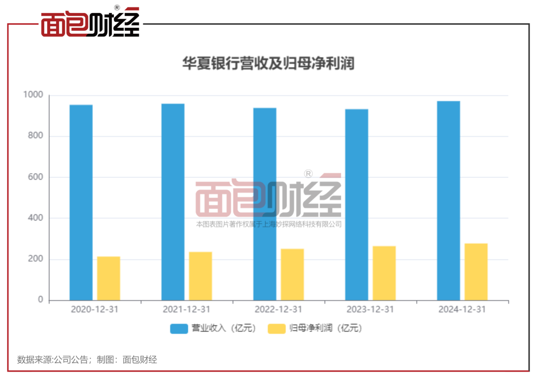 财报显示,2024年,华夏银行实现营业收入971.46亿元,较上年同期增加39.39亿元,增幅为4.23%;实现归母净利润276.76亿元,较上年增加13.13亿元,增幅为4.98%。