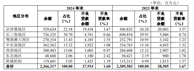 数据显示,截至2024年末,该行在京津冀地区的贷款余额为5296.24亿元,总贷款占比22.38%,在各区域中贷款规模排在第二位。较上年末相比,京津冀地区的贷款余额下降5.56%,不良贷款率上升0.1个百分点至3.67%。