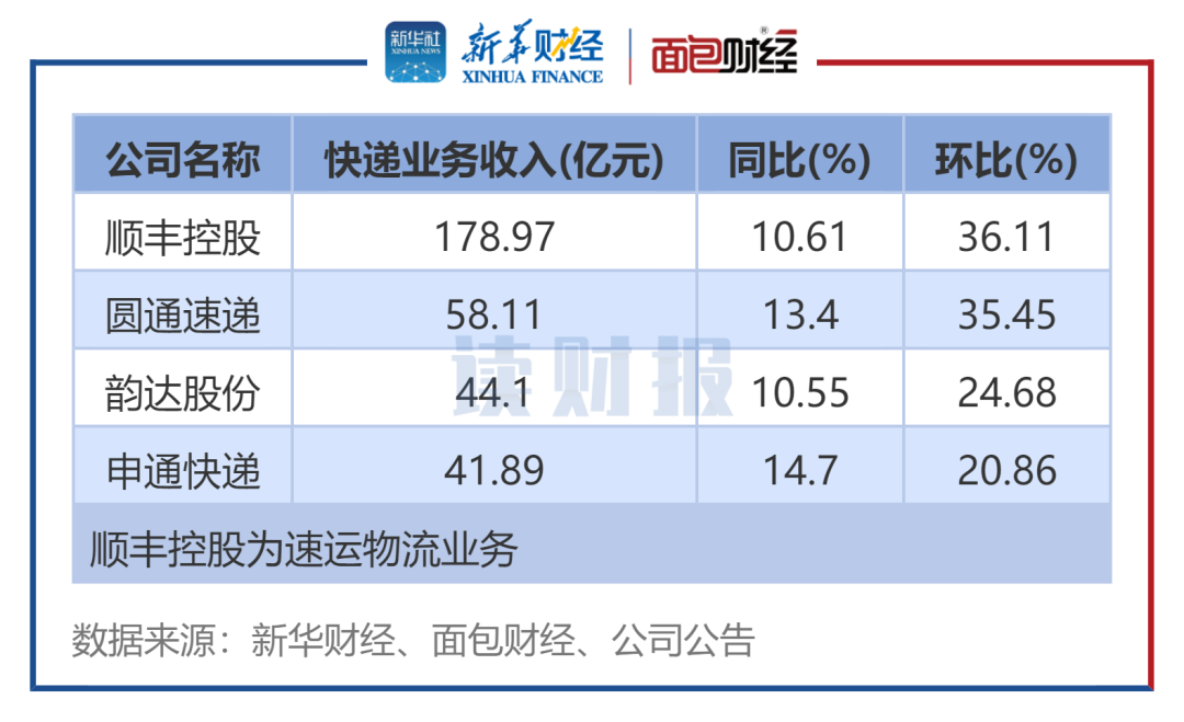 从环比变动来看,4家快递公司业务收入均有所增长,其中,顺丰控股的增幅最大,达36.11%;圆通速递的增幅位居第二,达35.45%。