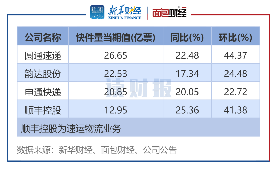 从同比变动来看,4家快递公司业务总量均有所增长,其中,顺丰控股的增幅最大,达25.36%;圆通速递的增幅位居第二,达22.48%。