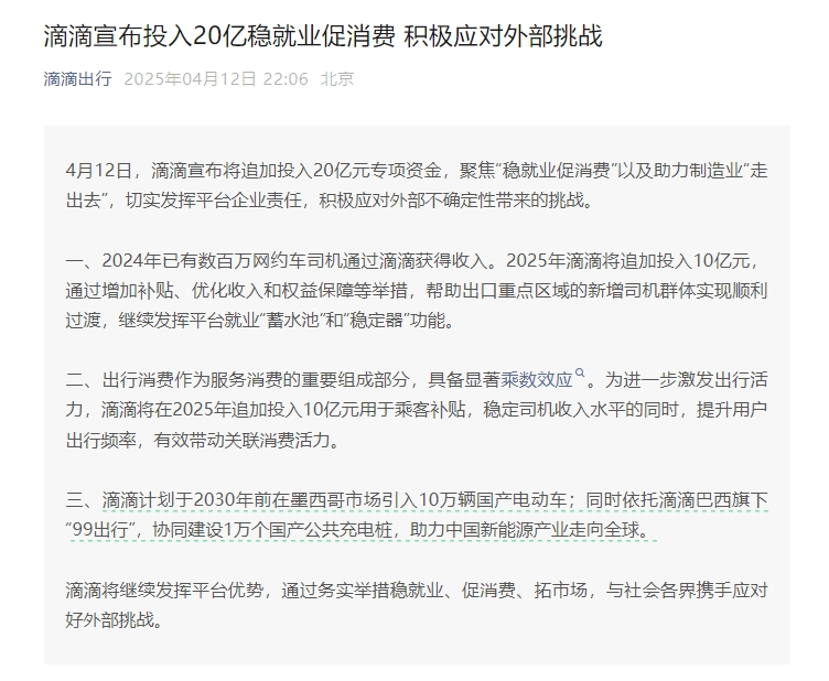 座谈会结束后的第四天,滴滴亮出了大招:投入20亿元专项资金,聚焦于“稳就业促消费”。