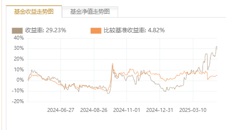 截至2025年4月23日数据(下同),该基金近一年收益率达29.23%,成立以来回报率达到16.67%,大幅跑赢业绩比较基准及同类平均。