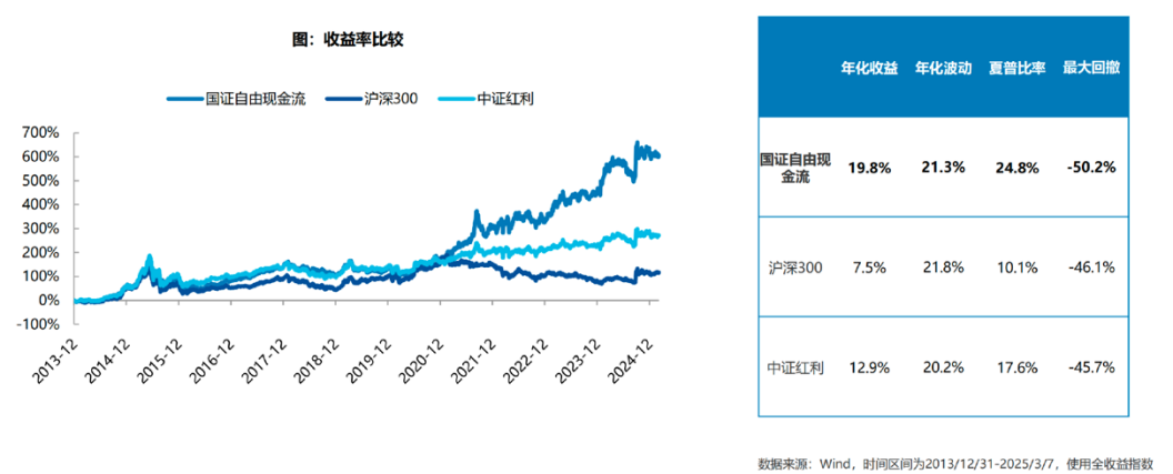 此外,自由现金流ETF易方达(159222)这样的奶牛组合,不仅仅每年给予股东的回报很可观,长期在资本市场上的表现也非常不俗。 2013 年到 2025 年 3 月,国证自由现金流指数的年化收益高达19.8%,而同期沪深 300 的回报只有7.5% ,中证红利也只有12.9%。换句话说,如果你拿10万元本金持有10年自由现金流指数能变成 60 多万,沪深300只能涨到20万出头,中证红利也只能涨到33万的样子。