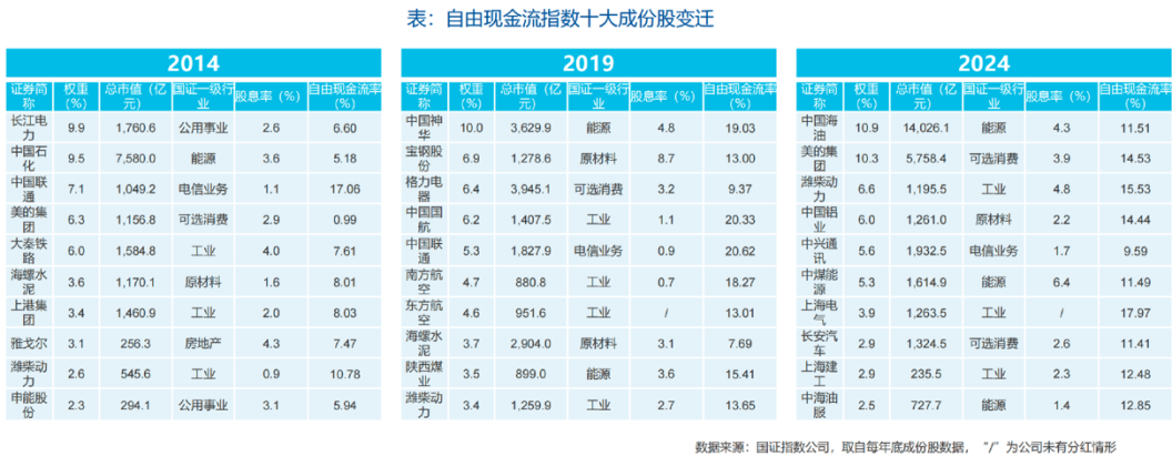 另外,指数相比单个企业更好的点就在于,它是会进行动态调整的,而且调仓节奏较快,一个季度就调一次。看看近十年自由现金流指数前十大的成分变化情况,变化还是挺明显的,从2014 年的长江电力、中国石化到2019年的中国神华、宝钢股份,再到2024年的中国海油、美的集团。如果我们选择追踪自由现金流指数的自由现金流ETF易方达(159222),相当于能始终拥有整个市场最会赚钱、最有钱的100家企业,这真的非常省心省事。