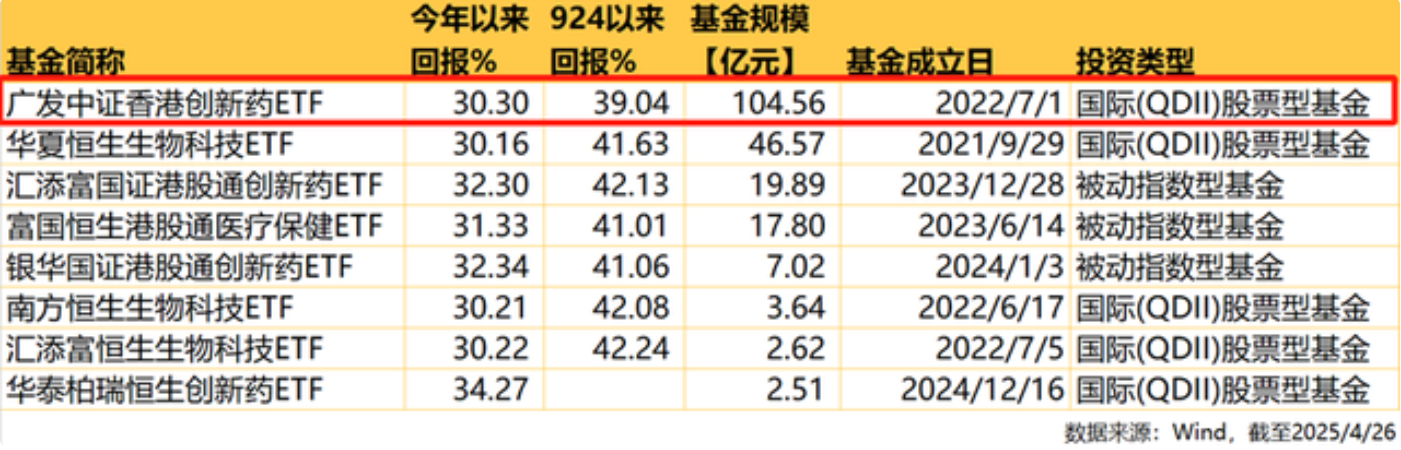 截至4月26日,全市场今年以来涨幅超过30%的ETF只有8只,全部是港股创新药方向。