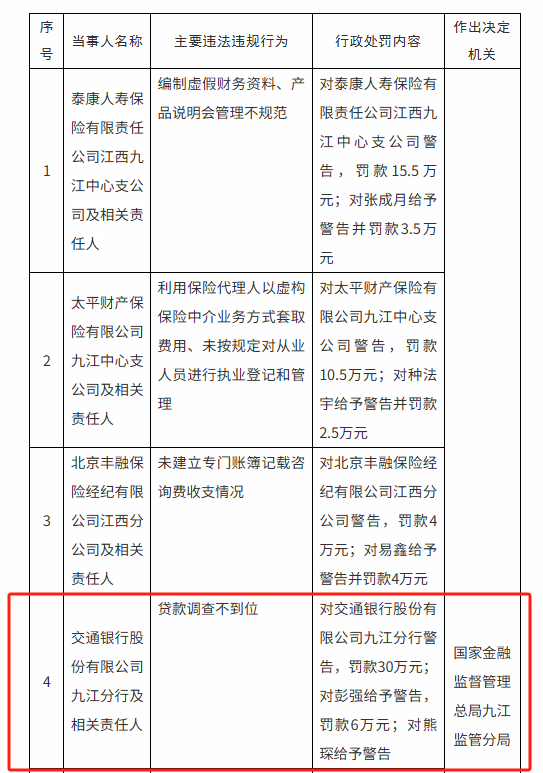 行政处罚信息公开表显示,交通银行股份有限公司九江分行因“贷款调查不到位”,被国家金融监督管理总局九江监管分局处以罚款30万元。同时,对相关责任人彭强给予警告,罚款6万元;对熊琛给予警告。