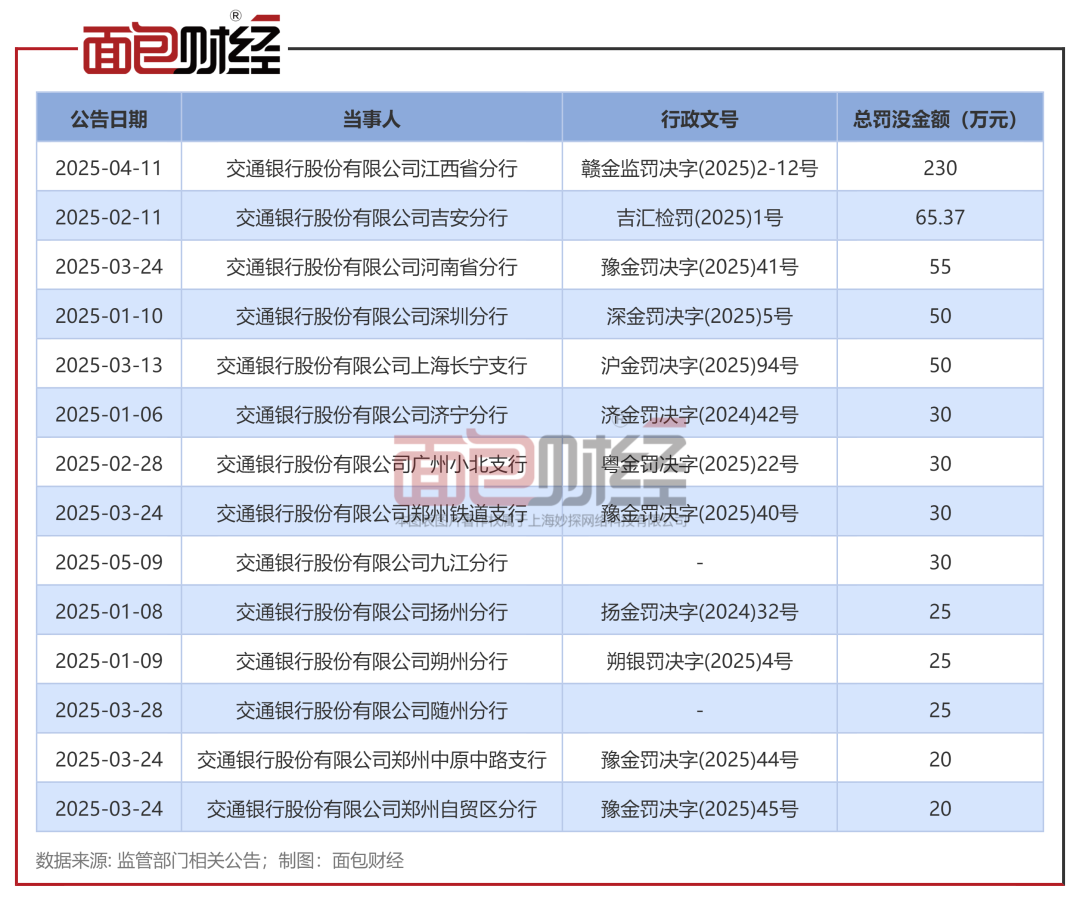 面包财经根据监管部门通报统计,今年以来,交通银行已收到多张罚单,总罚没金额超过680万元。