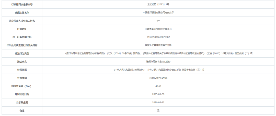 行政处罚信息显示,中国银行股份有限公司高安支行因违规办理资本金结汇业务,被国家外汇管理局宜春市分局罚款,并没收违法所得,总罚没金额为40.63万元。