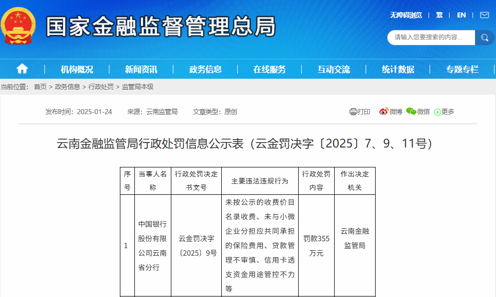 1月24日,中国银行股份有限公司云南省分行因“未按公示的收费价目名录收费、未与小微企业分担应共同承担的保险费用、贷款管理不审慎、信用卡透支资金用途管控不力等”,被云南金融监管局处以罚款355万元。同时,时任中国银行楚雄州分行营业部主任肖光武及马庆华,因贷款管理不审慎,被处以警告。