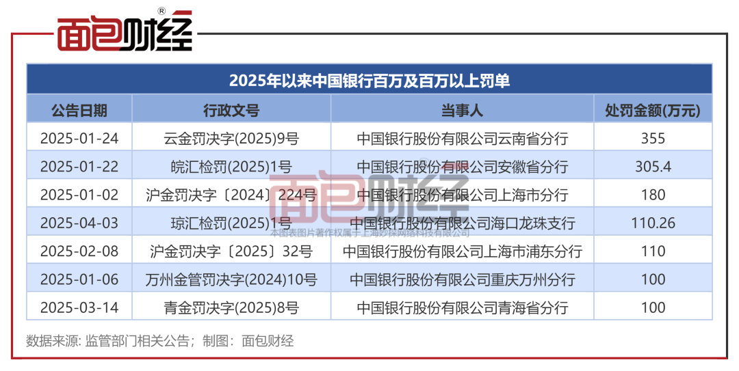 面包财经根据监管部门通报统计,今年以来,中国银行已收到多张罚单,总罚没金额超过2500万元,其中百万及百万以上罚单共计7张。