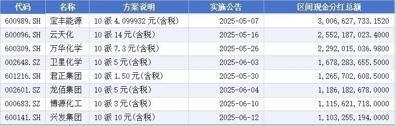 化学原料和化学制品制造业以宝丰能源、云天化、万华化学、卫星化学等企业为代表,8家上市公司分红金额超过10亿元。