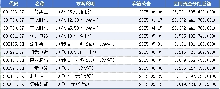 包括美的集团在内,伊利股份、格力电器、洛阳钼业、海天味业、恒力石化、公牛集团、牧原股份、三一重工、宝丰能源为民营企业上半年分红金额的前10名。