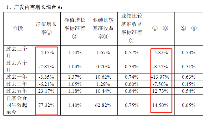 近日披露的基金二季报显示,广发内需增长混合 A今年上半年净值逆势下跌7.87%,跑输业绩比较基准8.57个百分点。过去一年、过去三年,该基金分别跑输业绩比较基准13.97个百分点、7.5个百分点。