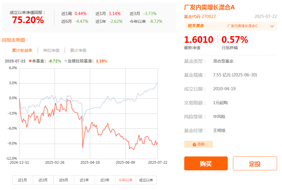 截至2025年7月22日,广发内需增长混合 A年内净值下跌8.72%,跑输业绩比较基准约12个百分点,同类排名2301/2321,表现垫底。