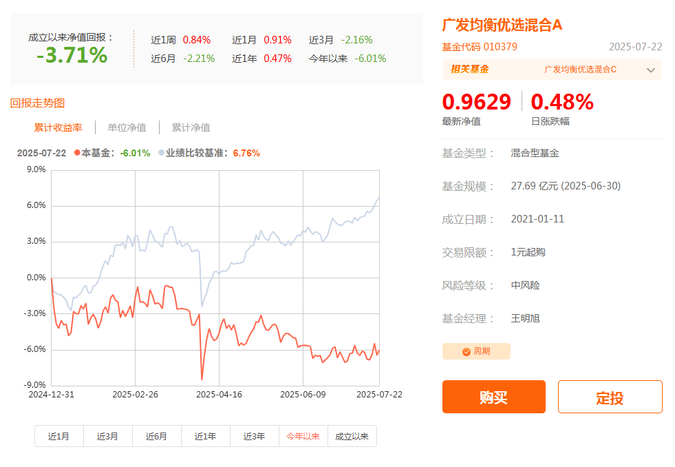 广发均衡优选混合A是王明旭在管产品中规模最大的产品,年内净值下跌6.01%,跑输业绩基准超12个百分点。截至7月22日,该基金成立超过4年,净值仍累计下跌3.71%。