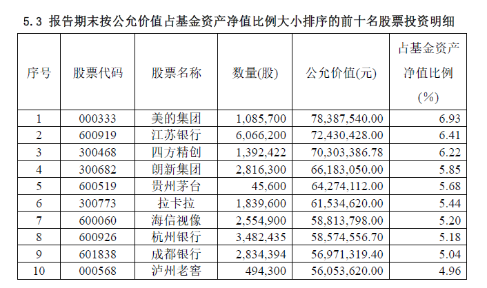 从具体重仓股来看,基金二季度末重仓股包括美的集团、江苏银行、四方精创、朗新集团、贵州茅台等企业。基金前十大重仓股中,超过半数为二季度新重仓。