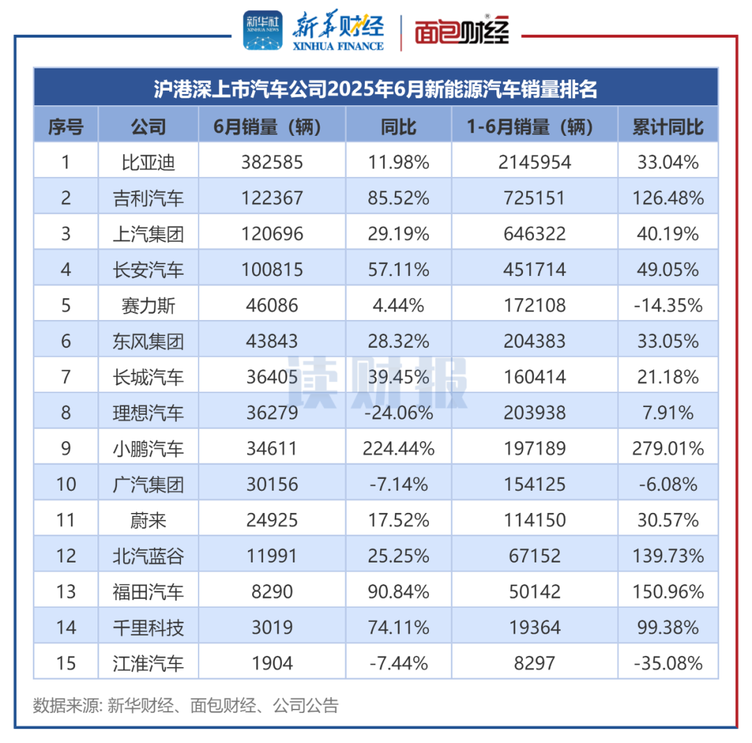 比亚迪在2025年6月共销售38.26万辆整车,位居第一;上半年累计销售214.6万辆,同比增长33.04%。上半年,纯电动、插电混动的销量分别为72.62万辆、88.1万辆,同比分别变动40.93%、23.71%。