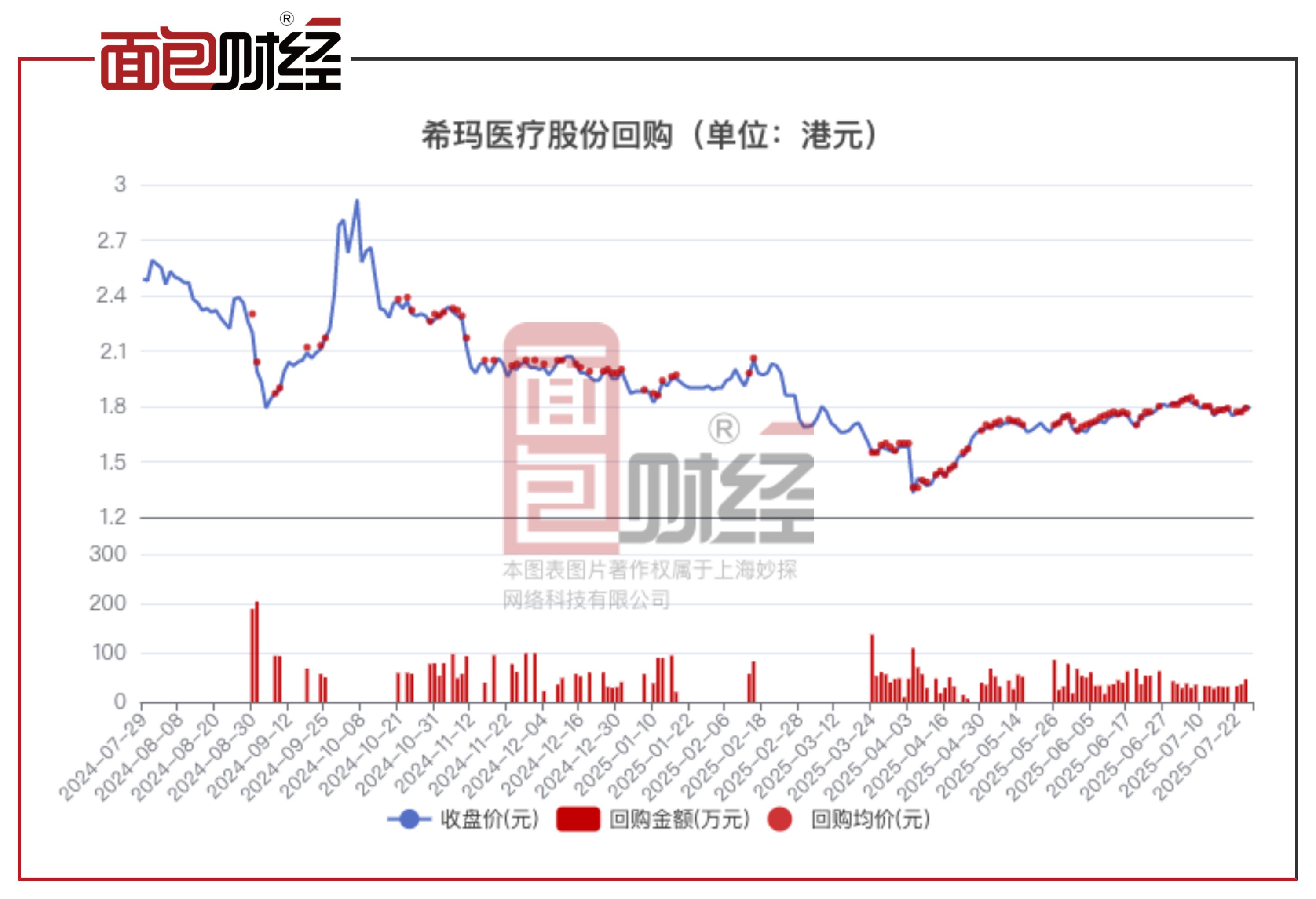 希玛医疗(3309.HK)近日持续回购股份。数据显示,截至7月24日,公司年内累计回购2016万股,合计耗资约3407万港元。