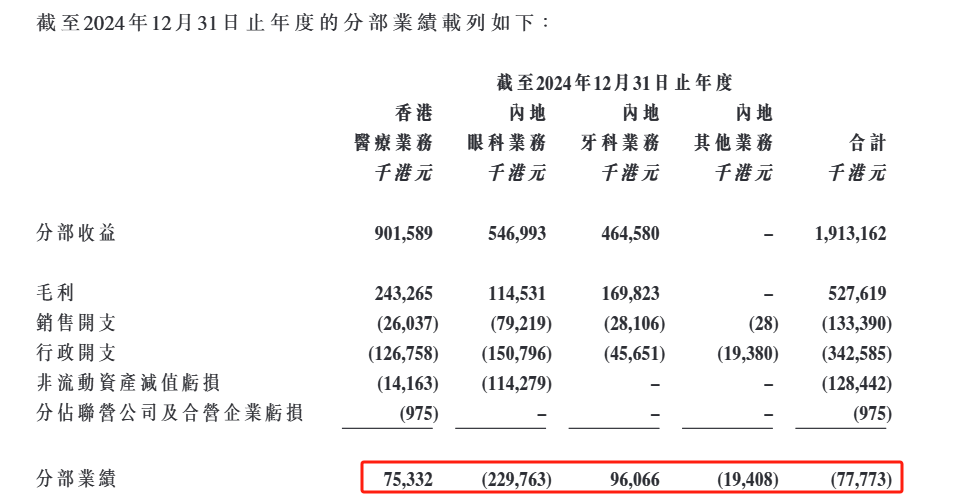 财报显示,2024年,公司分别就中国内地眼科业务分部的若干医院及诊所,以及香港医疗业务分部的肿瘤中心的商誉、物业、厂房及设备、使用权资产及其他无形资产作182.7百万港元及15.0百万港元的非现金减值支出。