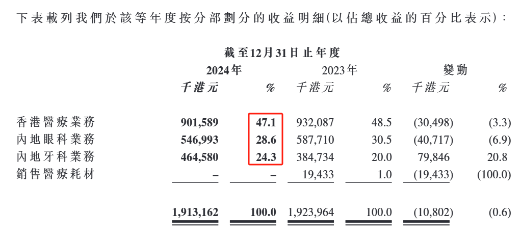 按照区域划分,希玛医疗的业务主要包括香港医疗业务、内地眼科业务、内地牙科业务等,2024年收入占比分别为47.1%、28.6%、24.3%。
