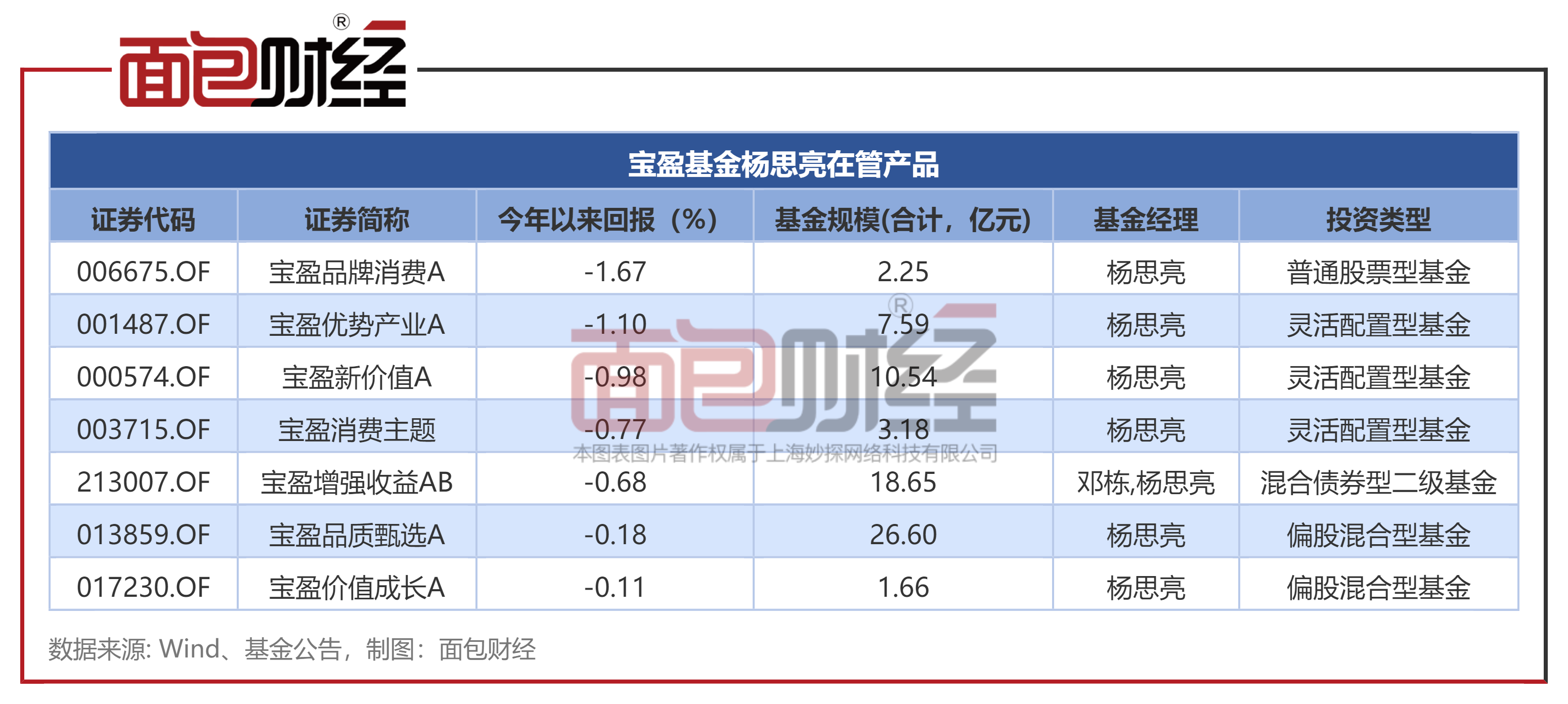面包财经梳理发现,宝盈品牌消费的基金经理杨思亮在管产品共有7只,其中独立管理产品有6只,年内均出现浮亏。