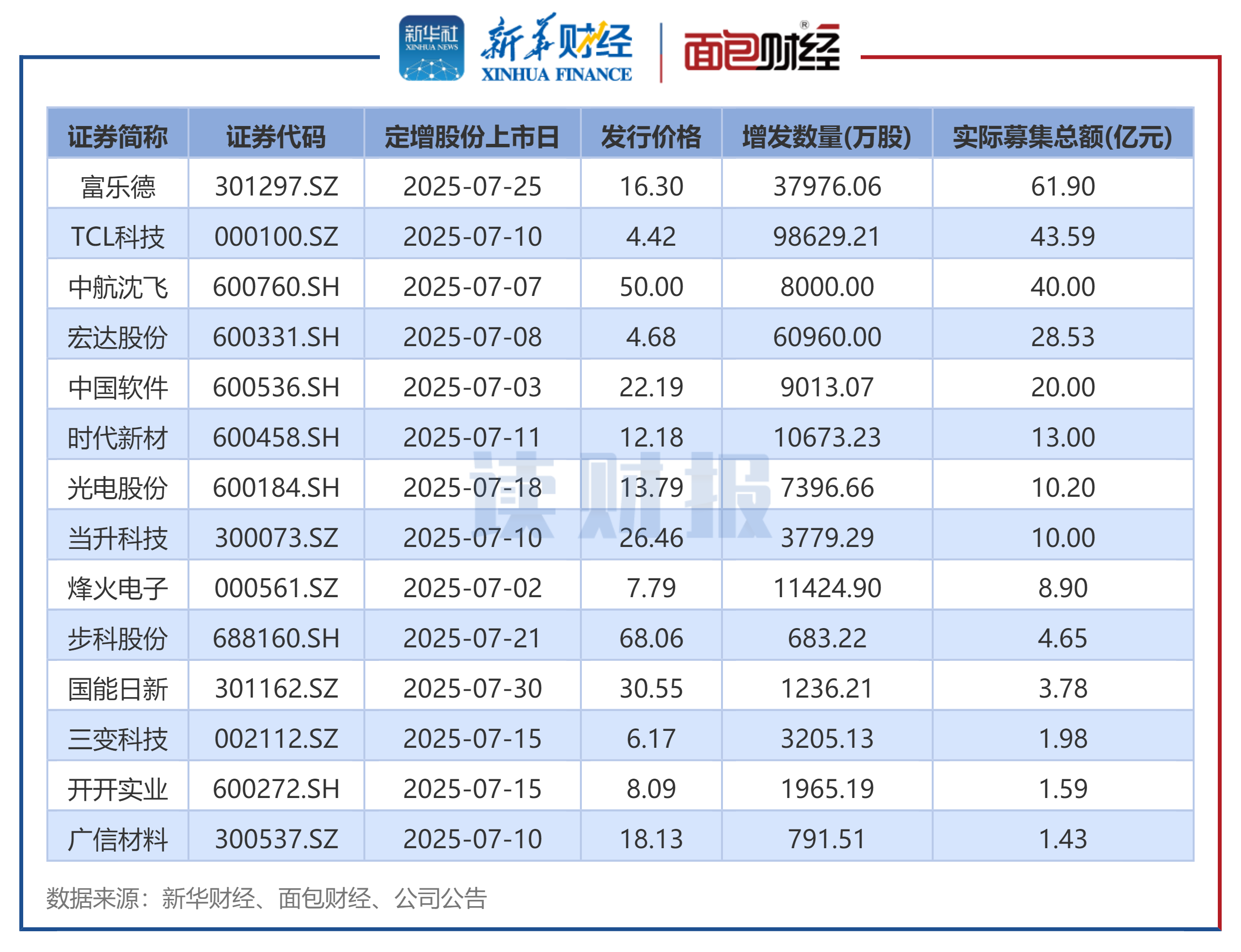 [摘要] 2025年7月A股共计实施定增14起