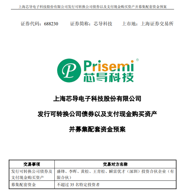 8月4日,芯导科技披露重大资产重组预案,拟通过发行可转换公司债券及现金支付方式购买上海吉瞬科技有限公司100%股权以及上海瞬雷科技有限公司17.15%的股权,从而直接及间接持有瞬雷科技100%股权,实现对瞬雷科技的100%控制,进一步完善上市公司在功率半导体领域的布局。