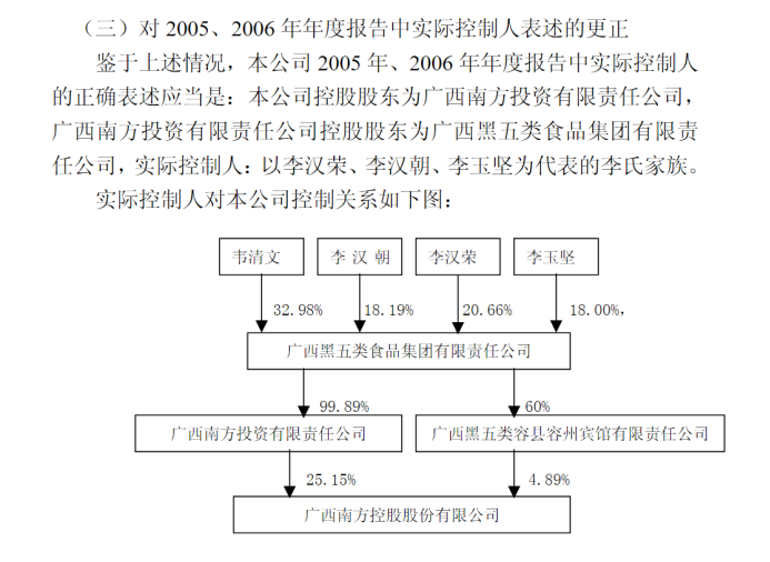 2004年3月-2006年6月,上市公司第七大股东广西南方投资有限责任公司(黑五类集团的前身,简称“南方投资”)通过受让、司法拍卖等方式持有上市公司25.09%股份,成为第一大股东,以李汉荣、李汉朝为代表的李氏家族成为上市公司的实际控制人。