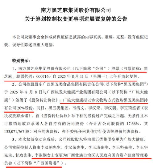 在内外交困之际,广西国资伸出了援手。2025年8月8日的公告显示,广旅大健康以总价9.42亿元受让20%股权成为黑芝麻控股股东,广西国资委成为实际控制人。