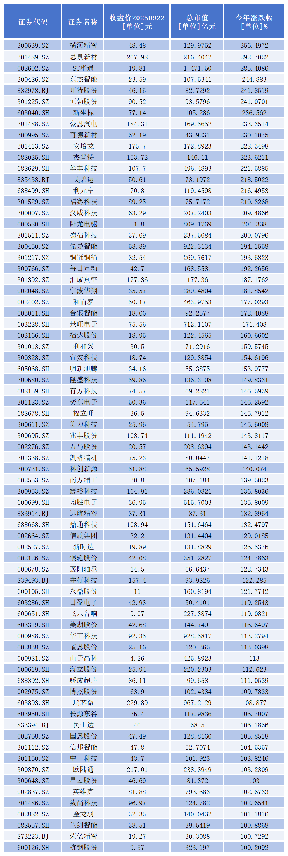 从二级市场表现看,今年以来股价涨幅超过100%的一共有73家上市公司。其中,横河精密、思泉新材、ST华通、东杰智能、开特股份、恒勃股份、新坐标、豪恩汽电、奇德新材、安培龙、杰普特、华丰科技、戈碧迦、利元亨、福赛科技、汉威科技、卧龙电驱、德福科技18家公司股价涨幅超过200%。
