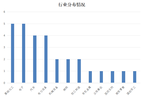 在三季报业绩预喜的上市公司中,基础化工行业有5家,电子行业5家,汽车行业4家,电力设备行业4家,机械设备行业3家。